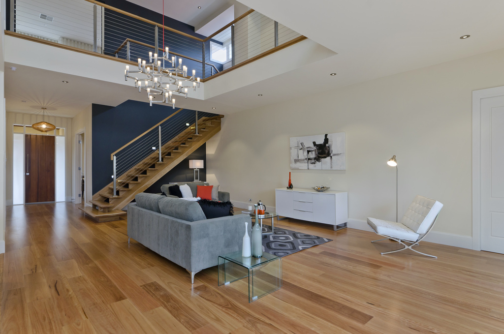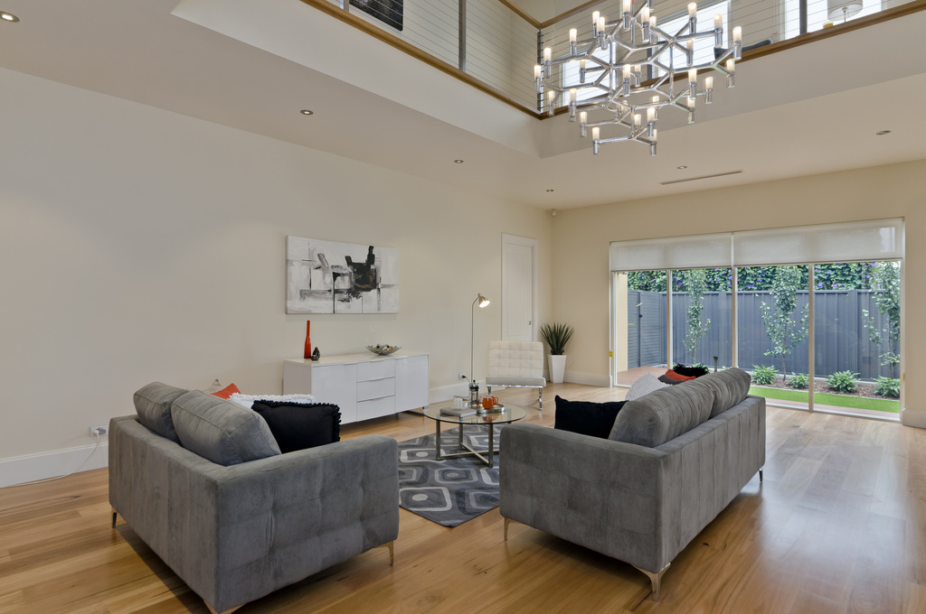 The entrance is enhanced by soaring ceilings while the beautiful Blackbutt timber floors lead to a sun-drenched living area and kitchen at the rear of the home. Floor to ceiling windows capture the lush, beautifully landscaped rear garden, bringing the outdoors in, while attractive timber feature work throughout adds further appeal.