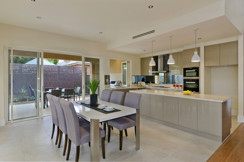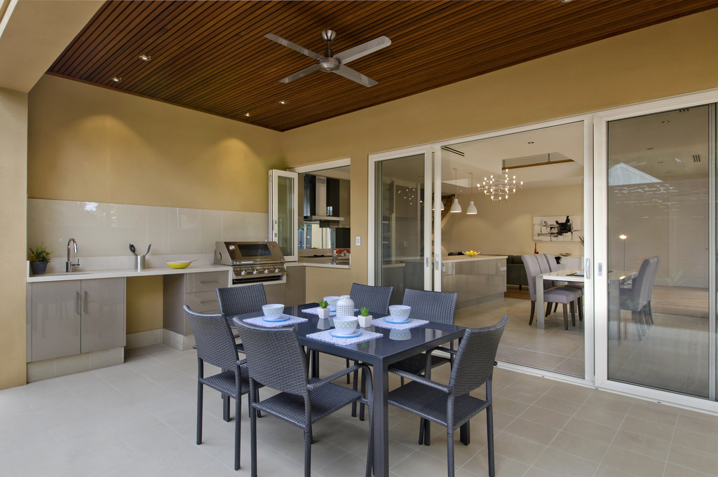 The sleek, striking kitchen featuring mirrored splashback, Caesarstone bench tops and fully integrated Miele appliances sits aside a beautifully spacious living and dining area. This idyllic setting for relaxing with the family or entertaining with friends is enhanced by the option of alfresco prep and dining provided by the outdoor kitchen with integrated mains gas BBQ.